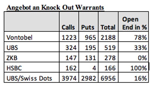 Ein Angebotsvergleich zeigt, dass das Angebot an SMI Knock Out Warrants ungenügend ist. In Einzelwerten wie Swiss Re ist dieses etwas breiter.