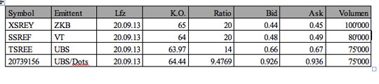 Aber wie gut ist das Angebot wirklich. Wir haben die Probe aufs Exempel gestellt und suchten je einen SMI Knock Out Call und Put sowie einen K.O. Call auf Swiss Re mit jeweils um die 5 Prozent Abstand zum aktuellen Kurs mit Verfall September. Wir konzentrieren uns hier bewusst auf die Produkte mit Verfall, da wir diese grundsätzlich als transparenter in der Preisfindung erachten.