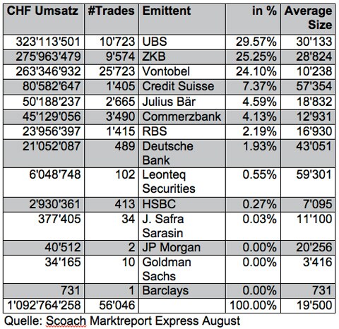 Goldman Sachs verbuchte nur noch 10 Trades, im Vorjahr waren es noch über 1'300 Abschlüsse. Die Goldmänner haben sich aus dem Scoach Hebelgeschäft fast vollständig zurückgezogen und emittierten praktisch nur noch Produkte über die ausserbörsliche Plattform Swiss Dots. Dort sind 10‘000 Produkte im Angebot. Die UBS offeriert über die Swiss Dots Swissquote Plattform dreimal so viel Produkte wie Goldman Sachs und setzt nach wie vor auch auf Scoach Produkte. Damit hat die UBS das breiteste Angebot am Schweizer Derivatmarkt. Zahlen gibt Swiss Dots nur spärlich bekannt. Die letzten „Zahlen“ stammen vom Juli (rund 50 Millionen Franken Umsatz monatlich).
