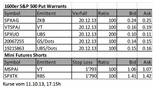 Wer daran glaubt, dass der Shutdown und eine mögliche Pleite der USA nicht an den US-Börsen vorbeigehen, der kann sich mit diversen-Short Produkten eindecken. Allerdings ist das in der Schweiz gar nicht so einfach. Dies liegt daran, dass die US-Aktien erst ab 15.30h gehandelt werden und die Derivatbörse Scoach Schweiz bereits um 17.15 schliesst. Wie immer gilt die Devise, dass Derivate immer erst gehandelt werden sollen, wenn die Hauptbörsen offen sind. An der Scoach Schweiz sind für den S&P 500 320 Warrants sowie je 50 Knock Outs und Mini Futures im Angebot. Eindeutig das grösste Angebot stellt die Bank Vontobel, gefolgt von UBS und ZKB. Bei den Mini Futures mischt wie üblich auch Royal Bank of Scotland mit.