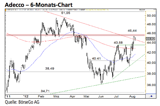 Rückblick: Nach einem steilen Ausverkauf im ersten Halbjahr 2011 stabilisierten sich die Aktien von Adeccco durch eine Bodenbildung in Form eines Mehrfachtiefs bei 32,05 CHF...