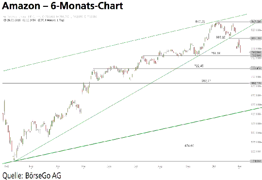 Nach einer Bodenbildung auf der 284,38 USD-Marke kam es ab Januar 2015 zu einem impulsiven Anstieg, welcher die Notierungen in einer ersten umfassenden Bewegung bis zur 682,77 USD-Marke führte. Ausgehend von der 474,00 USD-Marke folgte nach einer Zwischenkorrektur eine zweite Aufwärtswelle bis zur 847,21 USD-Marke. Hier drehte Amazon Anfang Oktober nach unten ab, konnte jedoch den mittelfristigen Aufwärtstrend vorerst halten. Die Käuferseite schaffte es anschliessend nicht mehr, den Wert auf ein neues Hoch zu führen, sodass zwischen der 803,10 USD-Marke und der 847,21 USD-Marke ein Doppelhoch ausgebildet wurde. Dynamisch wurde diese Formationslage an den Vortagen nach unten aufgelöst und die 803,10 USD-Marke mit einem Rücklauf bearish bestätigt.