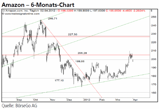 Ausblick: Die Kursbewegungen der kommenden Tage dürften Aufschluss über die weitere Trendtendenz geben. Können die Amazon Aktien nicht wieder über das Niveau von 200,00 USD zurückkehren, sollten weitere Abgaben nicht überraschen. Die Short-Szenarien: Stellt sich der schwache Wochenstart mit Kursen unterhalb von 200,00 USD als signifikat heraus, drohen weitere Verluste bis zur bereits mehrfach erfolgreich getesteten Unterstützung bei 177,10 USD. Diese sich abzeichnende Schwäche könnte man insbesondere bei dauerhaften Kursen unterhalb des letzten Zwischenhochs bei 209,85 USD „short“ handeln. Notierungen unter 177,10 USD sollten im weiteren Verlauf zusätzliche Abgaben bis 170,00 und darunter bis 160,00 USD ermöglichen. Die Long-Szenarien: Stellt sich der Kursrutsch vom Montag als vorübergehend heraus, könnten die Aktien mit einer Rückkehr über den Widerstandsbereich bei 205,28 USD das jüngste Zwischenhoch bei 209,85 USD anvisieren. Ein neues Hoch sollte die Aktien weiter aufwärts bis zum nächsten Widerstand bei 227,50 USD führen. Die Chance zur Markierung eines neuen Allzeithochs über 246,71 USD hinaus wäre dabei stark erhöht.