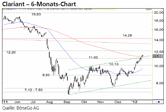 Ausblick: Die zunehmende Schärfe der laufenden Erholung legt nahe, dass es aktuell jederzeit zu einer ersten stärkeren Korrektur bei den Aktien kommen kann. Ein direkter Ansturm auf den Widerstand bei 12,20 CHF ist jedoch aus unserer Sicht wahrscheinlicher. Die Long-Szenarien: Verbleibt der Wert oberhalb der Trendkanaloberseite, dürfte ihn eine weitere Kaufwelle bis 12,20 CHF führen. Dort kann es zu einer ersten Korrektur kommen. Sollte diese Marke im weiteren Verlauf ebenfalls durchbrochen werden, kann sich die derzeitige Aufwärtsbewegung mittelfristig bis zur massiven Barriere bei 14,29 CHF fortsetzen. An dieser Stelle sollte nach unserer Auffassung eine übergeordnete, gegebenenfalls mehrwöchige Korrektur einsetzen. Entsprechend könnte man auf diesem Niveau erste Gewinnmitnahmen andenken. Die Short-Szenarien: Sollte der Wert unter die Trendkanaloberseite zurückfallen, kann eine leichte Korrektur auf 10,75 bis 11,00 CHF eingeleitet werden. Von dort aus könnte sich der Aufwärtstrend bereits fortsetzen. Wird die 10,75 CHF-Marke dagegen unterschritten, ist ein Rücksetzer auf 10,10 CHF wahrscheinlich. Doch würde der Aufwärtstrend der letzten Wochen erst unterhalb dieser Unterstützung ernsthaft angegriffen und Verluste bis 8,85 CHF folgen können.