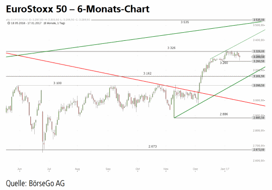 Rückblick: Im EuroStoxx 50 Index gelang Anfang Dezember2016 der Ausbruch aus dem mittelfristigen Abwärtstrend,was einen Anstieg über die bei 3.100 Punkten liegende Widerstandszonenach sich zog.