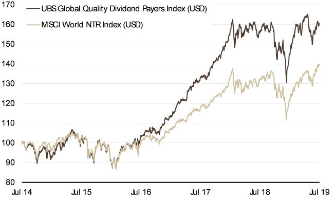 UBS Global Quality Dividend Payers NTR Index vs MSCI World NTR Index (5 Jahre, nur zu illustrativen Zwecken, Angaben in %)