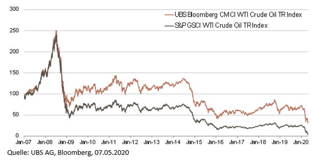 In der Tat erschwert die Form der Terminkurve das Öl-Investment zusätzlich, da Anlageprodukte auf Rohöl normalerweise auf Terminkontrakten (Futures) basieren. Sowohl die Brent- als auch WTI- Terminkontrakte befinden sich in einem so genannten Contango. Dabei gilt: Je länger die Laufzeit des Terminkontrakts, desto höher steht der Preis. Im vorderen Bereich (das heisst bei den kürzeren Laufzeiten) steigt die Kurve aktuell besonders steil an. Klassische Rohstoffindizes (1. Generation) sind vor allem hier positioniert. Sie gehen üblicherweise eine Positionierung in Futures zwischen einem und drei Monaten ein. Beim regelmässigen Austausch des verfallenden Kontrakts mit dem nächsten Future haben sie daher aktuell mit markanten Rollverlusten zu kämpfen. Für Schwierigkeiten könnte zudem ein abermaliges Auftreten von negativen Preisen bei den kürzeren Futures führen. Laut einer Meldung der Nachrichtenagentur Reuters mussten einige Anbieter von Indizes der ersten Generation bereits Anpassungen vornehmen. Gleichwohl bleibt die Nähe zum Spotpreis ein Vorteil der traditionellen Indexmethodik, da diese Indizes die starken Spotpreis-Bewegungen im Rohöl eher mitmachen.