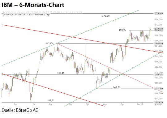 Rückblick: Die Aktien von IBM bewegten sich in den vergangenen Jahren ausgehend von der 215,90 USD-Marke abwärts, um im Februar 2016 auf der 116,90 USD-Marke ein wichtiges Zwischentief auszubilden.