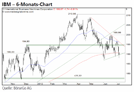 Ausblick: Das symmetrische Dreieck dürfte auf kurze Sicht weiter Bestand haben. Dennoch ist derzeit nach dieser Seitwärtsphase mit einem Kursrückgang zu rechnen. Die Short- Szenarien: Sollten die Aktien von IBM unter das Dreieck zurücksetzen und im Anschluss auch unter das Tief von Anfang Juni bei 187,00 USD einbrechen, würde dies nach unserer Einschätzung eine Fortsetzung der Abwärztsbewegung seit Mai bedingen. Entsprechend könnte man einen Einbruch unter 187,00 USD „short“ handeln. In der Folge dürften die Aktien bis 182,00 USD und darunter auf 177,77 USD zurücksetzen. Sollte diese markante Unterstützung wider Erwarten nicht verteidigt werden können, wären weitere Verluste bis 173,60 USD die Folge. Die Long-Szenarien: Im aktuellen Umfeld wäre erst ein nachhaltiger Ausbruch über das Zwischenhoch bei 199,99 USD bullish zu werten. In diesem Fall wäre ein Wiederanstieg entlang der Unterseite der gebrochenen Aufwärtstrendlinie wahrscheinlich. Ein erstes Ziel dieser Aufwärtsbewegung läge bei 205,00 USD. Darüber könnte der Wert bereits bis 210,69 USD ansteigen.