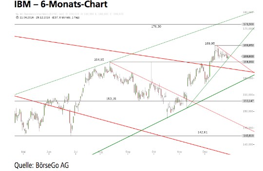 Die Short-Szenarien: Abgaben unter die 164,95 USD-Marke würden auch aus dem Aufwärtstrend der Vorwochen führen, sodass davon ausgehend ein Rücklauf bis zum gebrochenen Abwärtstrend bei derzeit 163,00 USD möglich wäre. Fällt IBM auch unter dieses Niveau, könnte der mittelfristige Aufwärts- trend bei 158,00 USD erreicht werden.