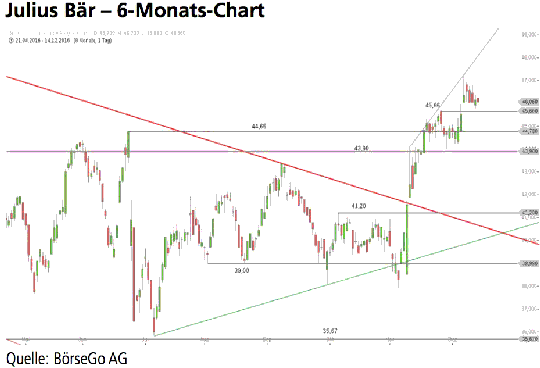 ... Es gelang im Verlauf 2015 ein Anstieg zur 54,55 CHF-Marke, welcher ab Juni 2015 komplett verkauft wurde. Die Notierungen bewegten sich innerhalb eines Abwärtstrendkanals, um die 35,67 CHF-Marke erfolgreich zu testen. Darüber wurde ab Juni 2016 eine symmetrische Dreiecksformation ausgebildet. Anfang November erfolgte der trendbestätigende Ausbruch aus dieser Formationslage nach unten, was sich jedoch als Bärenfalle darstellte. In einer schnellen Bewegung brach der Wert anschliessend nach oben aus und überwand den mittelfristigen Abwärtstrend. In den vergangenen Wochen schoben sich die Notierungen durch die Widerstandszone um 43,90 CHF hindurch, was mit einem Rücksetzer bestätigt wurde. Zuletzt kam es zu einem weiteren Aufwärtsimpuls bis zur 47,00 CHF-Marke.