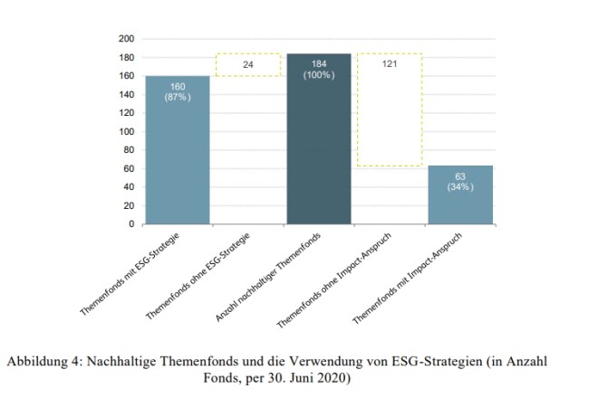 Nachhaltige Fonds werden in der Öffentlichkeit oft mit einer positiven Wirkung auf Umwelt und Gesellschaft assoziiert. «Einen positiven ökosozialen Effekt verspricht allerdings nur eine Minderheit der angebotenen Nachhaltigkeitsfonds explizit», sagt Manfred Stüttgen. So weist bei den total 184 nachhaltigen Themenfonds lediglich ein Drittel - und hier vorwiegend die Umweltund Klimafonds - auf eine potenziell positive Wirkung («Impact») hin (Abbildung 4). «Wer bei allen nachhaltigen Fonds pauschal eine positive Wirkung erwartet, unterliegt einem verbreiteten Missverständnis», so Stüttgen. Allfällige Vorwürfe gegenüber nachhaltigen Fondsanbietern, «Greenwashing» zu betreiben, erscheinen laut den Studienautoren überzogen.