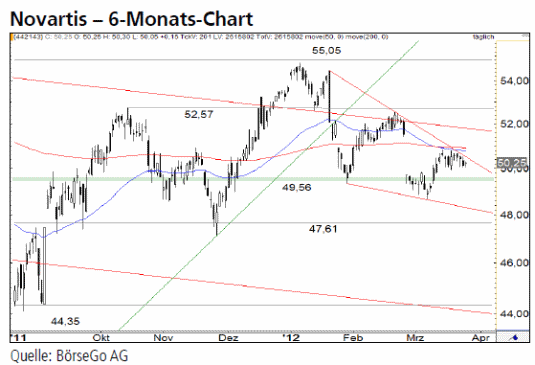 Ausblick: Übergeordnet könnte der Chartverlauf seit dem Januar-Hoch als bullisher Keil interpretiert werden. Dennoch sollte die Dynamik der Abwärtsbewegungen der letzten Wochen zur Vorsicht ermahnen. Die Long-Szenarien: Noch haben die Käufer die Chance den Aufwärtstrend auch mittelfristig fortzusetzen. Hierfür muss die Unterstützungszone zwischen 47,61 und 49,56 CHF nach unserer Auffassung jedoch unbedingt verteidigt werden. Gelänge zudem ein Anstieg über 50,80 CHF, könnte sich die Erholung bis 52,57 CHF fortsetzen. Allerdings sollte diese Marke für ein nachhaltiges Kaufsignal überschritten werden. In der Folge könnte der Wert bis 55,05 CHF und darüber bereits bis 58,35 CHF ansteigen. Die Short- Szenarien: Wird die Unterstützung bei 47,61 CHF nachhaltig durchbrochen, würde dies ein mittelfristiges Verkaufssignal auslösen, welches man entsprechend „short“ handeln könnte. In der Folge dürften die Aktien von Novartis zunächst bis 44,35 CHF zurücksetzen. Darunter wäre eine Ausweitung bis 42,08 CHF denkbar.