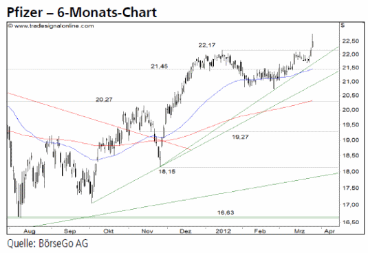 Rückblick: Seit Juli 2010 befinden sich die Aktien von Pfizer ineinem soliden Aufwärtstrend, der sie in einer ersten ...
