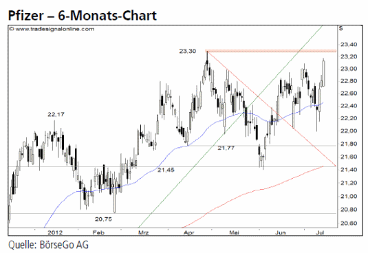 Ausblick: Mit dem Verhindern des Verkaufsignals haben die Käufer ihre Stärke untermauert und könnten den neu gewonnenen Schwung zu einem direkten Kaufsignal nutzen. Die Long-Szenarien: Sollten die Aktien von Pfizer über den Widerstand bei 23,30 USD ausbrechen, könnte sich die laufende Aufwärtsbewegung bis 24,70 USD fortsetzen. Wird die 23,30 USD-Marke durchbrochen, wäre ein mittelfristiges Kaufsignal aktiv, welches man entsprechend „long“ handeln könnte. In der Folge dürften die Aktien bis 25,85 und 26,00 USD ansteigen. Nach einer kurzfristigen Korrektur könnte sich die Hausse auf mittlere Sicht bis 27,73 USD fortsetzen. Die Short-Szenarien: Scheitert der Wert dagegen an 23,30 USD und setzt anschliessend unter 22,45 USD zurück, könnte nurmehr die Unterstützung bei 22,00 USD einen direkten Rückfall auf 21,77 USD und darunter bis 21,45 USD aufhalten. Entsprechend wäre mit einem Rückfall unter 22,00 USD der Anstieg der letzten Tage beendet. Oberhalb von 21,45 USD befände sich der Wert jedoch weiterhin in einer bullishen Ausgangssituation. Erst ein nachhaltiger Bruch dieser Marke wäre negativ zu werten und hätte Verluste bis 20,75 und 19,27 USD zur Folge.