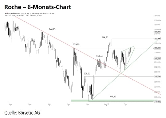 Rückblick: Die Aktien von Roche bildeten im Dezember 2016 das zweite Tief eines bullishen Doppelbodens aus und stoppten damit den vorherigen Abwärtstrend an der Unterstützung bei 218,36 CHF.