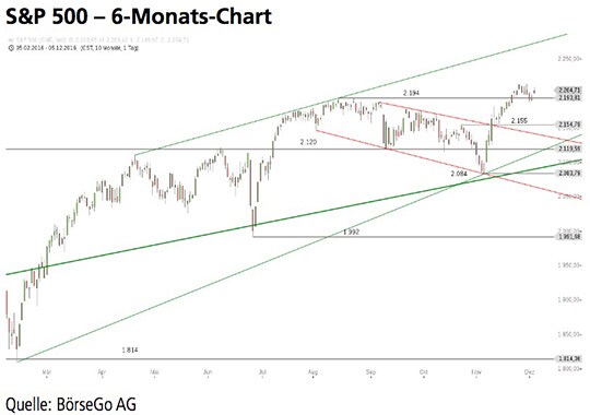 Die Notierungen konnten sich über die 2’155 Punkte-Marke bewegen und dabei auch gleichzeitig die bullishe Flaggenformation der vergangenen Wochen nach oben auflösen. Das dabei generierte Kaufsignal führte den Index direkt über die 2’194 Punkte-Marke auf ein neues langfristiges Hoch. An den Vortagen kam der Kaufdruck jedoch wieder zum Erliegen, was einen Rückfall zur 2’194 Punkte-Marke zur Folge hatte. Hier konnten sich die Notierungen zuletzt wieder nach oben absetzen.