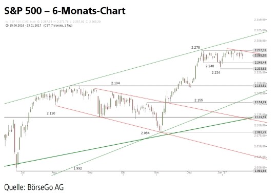 Rückblick: Ausgehend von der 2.084 Punkte-Marke kam es im S&P 500-Index ab Anfang November 2016 zu einem starken Anstieg, welcher die Notierungen bis zur 2.278 Punkte-Marke führte.