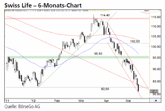 Ausblick: Sollte die Marktschwäche der Aktien anhalten, ist mit einem weiteren dramatischen Rückfall zu rechnen. Nur ein rascher Wiederanstieg über 82,60 CHF könnte dies aus unserer Sicht verhindern. Die Short-Szenarien: Verbleibt der Wert unterhalb von 82,60 CHF, wäre ein langfristiges Verkaufssignal aktiv. Diesen Rücksetzer könnte man entsprechend mit einem Shortengagement handeln. In der Folge dürften die Aktien von Swiss Life zunächst bis 76,00 CHF zurückfallen. Darunter könnte sich der steile Abwärtstrend bis 60,85 CHF ausweiten. Sollte es auch dort zu keiner Bodenbildung kommen, wäre sogar das Tief des Jahres 2009 bei 42,90 CHF als langfristiges Ziel dieses Ausverkaufs zu nennen. Die Long-Szenarien: Können sich die Aktien dagegen über 82,60 CHF zurückarbeiten und im Anschluss auch über den Zwischenwiderstand bei 86,70 CHF ausbrechen, wäre mit einer leichten Erholung zu rechnen. Diese dürfte den Wert zunächst bis 95,55 CHF zurückführen. Nach unserer Einschätzung würde allerdings erst ein Bruch dieser starken Barriere die Gefahr eines Kurseinbruchs bis weit unter die 82,60 CHF verhindern können. Entsprechend könnte man einen Anstieg über 95,55 CHF „long“ handeln.