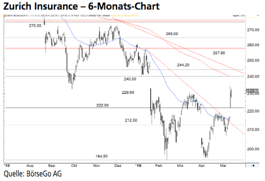 Rückblick: Im Rahmen eines übergeordneten Abwärtstrends waren die Aktien von Zurich Insurance bis zum Februar dieses Jahres an die wichtige Unterstützung bei 194,50 CHF eingebrochen. Dort setzten sich die Bullen allerdings erfolgreich zur Wehr.
