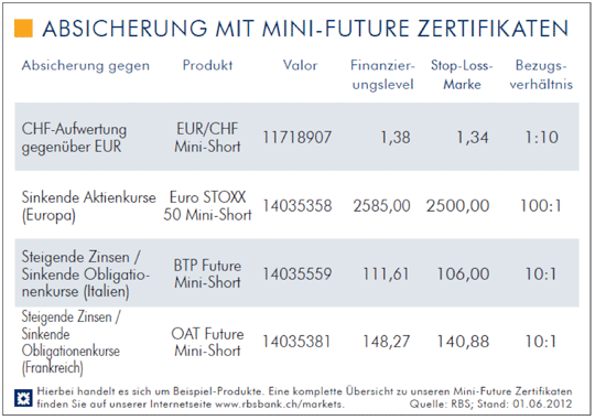 Welches Land betritt nach Spanien als nächstes die europäische Schuldenbühne? Italien oder sogar Frankreich? Die Zinssätze zu denen sich Spanien zuletzt refinanzieren konnte schossen auf über 6%. Mit den Kursen der Staatsobligationen ging es entsprechend bergab. Im Gegensatz zu Spaniens Staatsobligationen lassen sich Italienische- und Französische Staatsobligationen mit Mini-Futures einfach handeln. Anleger, die für Italien oder Frankreich einen Anstieg der Obligationenzinsen erwarten, können sich mit Mini-Shorts gegen fallende Obligationenpreise absichern. Mit Mini-Shorts auf Indizes lassen sich zudem Länderrisiken mit einer Transaktion absichern und so hohe Transaktionskosten vermeiden. (fs)