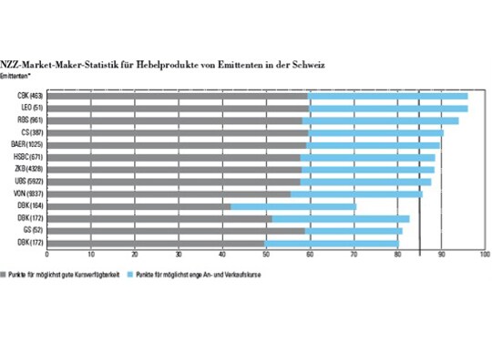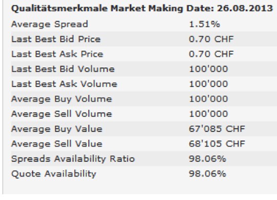 Die NZZ berücksichtigt einzig die Kursverfügbarkeit und die Spreads. Dabei wurde ein 60-40 Verhältnis gewählt. Ab der Schwelle von 85% erachten die NZZ die Arbeit des Emittenten als gut. In der aktuellen Grafik werden aber bspw. für die Deutsche Bank (DBK) gar drei unterschiedliche Werte geführt. Besser als beim PMMI gefällt hier die Darstellung.