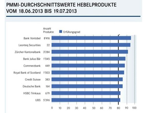 Das Derivatemagazin Payoff bietet eine solche Hilfe mit dem Payoff Market Making Index (PMMI). Gemäss diesen Zahlen bietet die Bank Vontobel, ZKB und die Bank Julius Bär die besten Zahlen bei den Hebelprodukten. Der PMMI setzt sich zusammen aus 40% Kursverfügbarkeit, 40% Spread und 20% Volumengewichtung. Werte über 80% gelten als gut, Werte über 90% als sehr gut. Wünschenswert wäre hier die genaue Aufteilung der Werte in der Grafik.