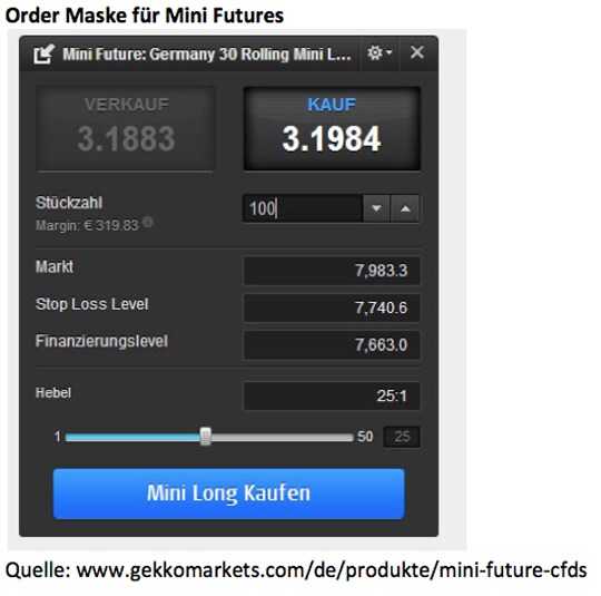 Genau auf diese Produkte-Flut hat ein noch junger CFD-Anbieter in Deutschland ein Angebot konstruiert. Seit letztem September sind via den Broker "Gekko Global Markets" Mini Futures handelbar. Dabei können Kunden selber ein Produkt konstruieren, in dem der gewünschte Hebel bestimmt wird und die gewünscht Stückzahl eingegeben wird.