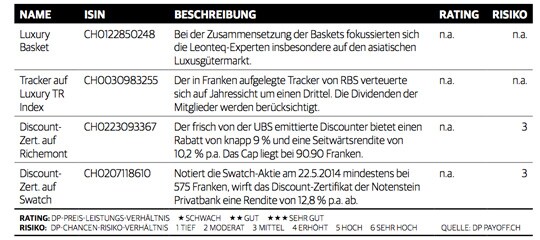 «China ist der wichtigste Player auf dem asiatischen Markt, aber nicht der einzige», sagt Fondsmanagerin Andrea Gerst von Swiss & Global Asset Management. Einen Ausgleich schafft ihr zufolge die steigende Nachfrage nach Edel- marken in anderen asiatischen Ländern wie Thailand, Indonesien, Malaysia oder in den Phi- lippinen. Expertin Gerst geht davon aus, dass die Luxusgüterindustrie 2013 mit 6 bis 8 Prozent wachsen wird. «Die Vielfalt der Absatzmärkte und der gestiegene Luxusgüterkonsum in vielen verschiedenen Regionen und Ländern geben dem Sektor positive Impulse», sagt die Fondsmanagerin. Mit entsprechenden Index-Trackern können sich Anleger einen Hauch von Luxus ins Depot holen. Ein diversifiziertes Engagement ist zum Beispiel mit dem zwölf Mitglieder starken Basket von Leonteq möglich. Mit 15 Titeln ist der RBS Luxury Index Tracker der RBS sogar noch etwas breiter aufgestellt. Doch aufgepasst: Index-Papiere benötigen steigende Kurse, um Gewinne erzielen zu können – anders als Discount-Zertifikate. Konservative Naturen können mit ausgewählten Rabattpapieren in die heimischen Vertreter Richemont und Swatch investieren. (ci)
