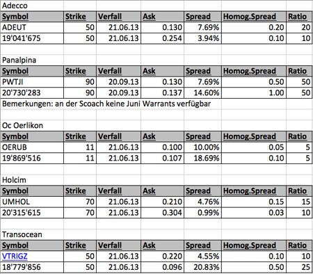Die Momentaufnahme verdeutlicht, dass sich vergleichen lohnt. Bei Adecco und Holcim zeigt Swiss Dots die besseren Spreads. Bei Holcim wird sogar ein Spread von unter einem Rappen gezeigt, was nur auf der Swissquote Plattform möglich ist. Bei den kleineren Werten Panalpina und OC Oerlikon zeigt das breitere Angebot an der Scoach ihre Wirkung und punktet mit besseren Spreads. Auch beim für Emittenten schwierig handelbaren Transocean wird über Scoach die klar besseren Spreads gezeigt. Bei den Europäern (Münchner Rück und SoGen) findet man keine entsprechenden Angebote auf Swiss Dots.