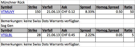 Nichts desto trotz, kann es sich lohnen gerade bei grossen SMI Werten und Arbitrage anfälligen Werten wie Dax oder Gold auf Swiss Dots auszuweichen. Hier steht eine grosse Fülle von Produkten zur Verfügung. Der Spreads sind teils markant tiefer und die die längere Handelbarkeit von bis 22.00h machen die Plattform bei gewissenWerten zur echten Alternative. Allgemein ist das Angebot an der Scoach aber breiter an Basiswerten und transparenter. Die fehlende Breite zeigt sich bei Münchner Rück und SoGen, wo derzeit nur Scoach Produkte handelbar sind.
