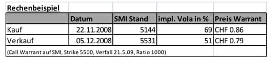 Das Beispiel lässt darum eine weiter Regel zu: „Kaufen Sie keine Warrants, wenn die Volatilitäten sehr hoch sind“.