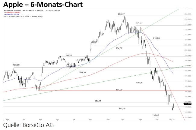 Rückblick: Seit dem Rekordhoch bei 233,47 USD ebbte der Aufwärtstrend bei den Aktien von Apple ab und ging mit dem Bruch der Unterstützung bei 219,62 USD Ende Oktober 2018 in eine massive Abwärtsbewegung über.