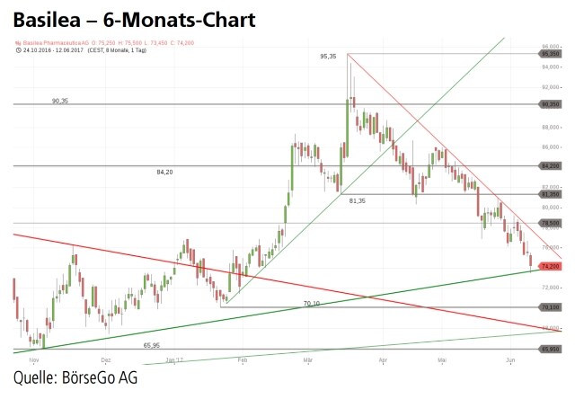Rückblick: Die Aktien von Basilea bewegten sich im Januar 2016 durch die wichtige Unterstützung bei 84,20 CHF hindurch, konnten sich aber ausgehend von der 58,80 CHF-Marke stabilisieren.