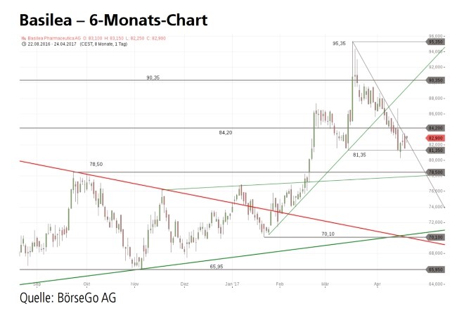 Rückblick: Die Aktien von Basilea bewegten sich im Verlauf 2015 stark abwärts und rutschten auch durch die bei 84,20 CHF liegende wichtige Unterstützungszone hindurch.