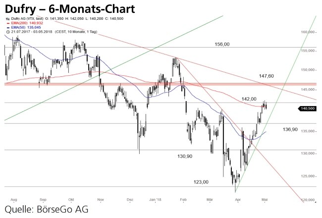 Rückblick: Die Aktien von Dufry befinden sich seit rund einem Jahr in einer mittelfristigen Abwärtsbewegung, in deren Verlauf im November 2017 die wichtige Unterstützung bei 147,60 CHF unterschritten wurde.