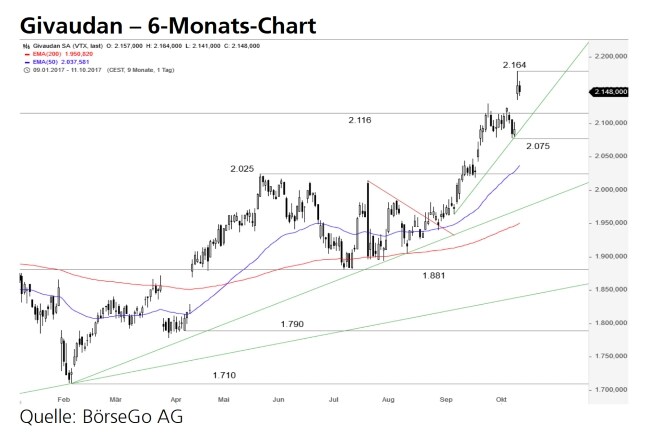 Höchststand bei 2.164 CHF fortsetzen dürften. In diesem Fall könnten die Aktien zügig bis 2.220 CHF steigen, ehe an dieser