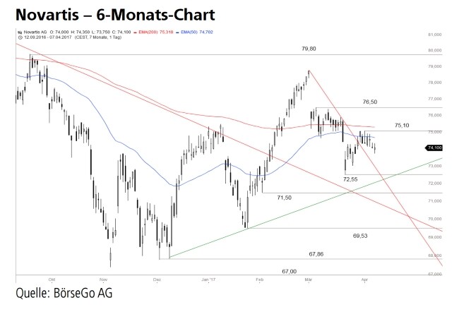 Rückblick: Das zweite Halbjahr 2016 wurde bei den Aktien von Novartis von einem Abwärtstrend dominiert, der den Wert bis an den Bereich der langfristigen Unterstützung bei 67,00 CHF einbrechen liess.