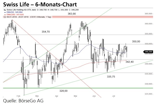 Rückblick: Seit Monaten dominiert bei den Aktien von Swiss Life ein breitangelegter Seitwärtsmarkt, der auf der Oberseite durch das mehrjährige Hoch bei 363,90 CHF begrenzt wird.