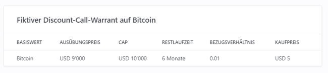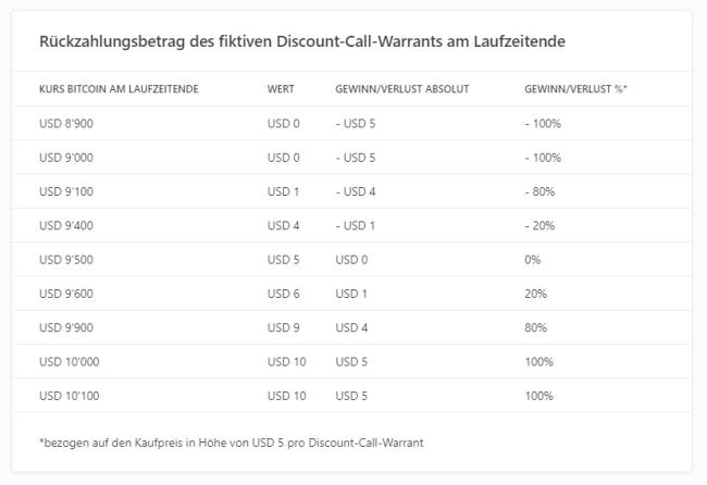 - Szenario 3: Bitcoin schliesst am finalen Bewertungstag auf oder unter dem Ausübungspreis von 9'000. Dies bedeutet, dass der Discount-Call wertlos verfällt und der Anleger einen Totalverlust erleidet.