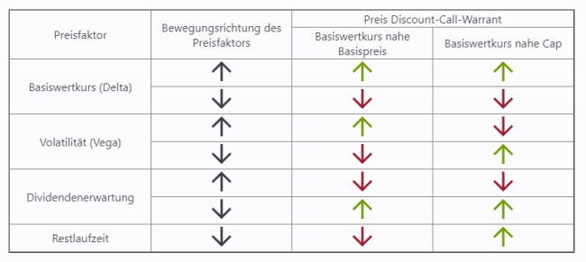 Grundsätzlich beeinflussen die einzelnen Preisfaktoren den Preis des Discount-Call-Warrants während der Laufzweit wie folgt: