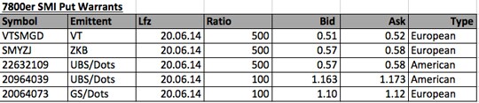 Wichtig bei Warrants ist immer der Vergleich. Wir präsentieren hier verschiedene SMI Warrants mit einem Strike bei 7800 und einer Laufzeit bis Juni. ZKB ist bei einem identischen Warrant ganze 7 Rappen teurer wie Vontobel. UBS bietet zwei verschiedene Warrants über Swiss Dots an, dabei ist aufgrund des tieferen homogenisierten Spread das 100er Ratio zu bevorzugen. Der Goldman Sachs Warrant ist im Unterschied zur UBS europäischer Ausübung und hat einen höheren Spread wie der von der von der UBS.