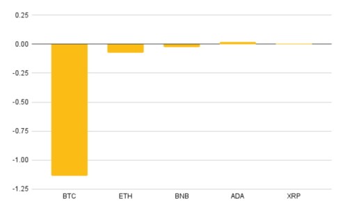Die Renditen der Top-5 Kryptoassets in der letzten Woche waren wie folgt - BTC (-1.14%), ETH (-0.07%), BNB (-0.03%), ADA (0.02%), XRP (0.003%).
