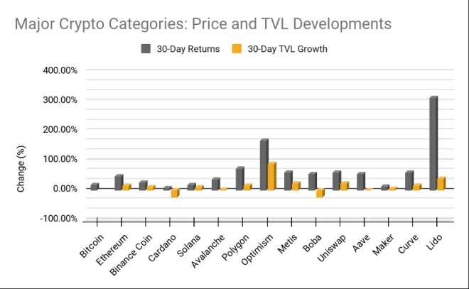 Abbildung 1: Entwicklung von Preis von TVL (total value locked) der grössten Kryptoasset-Kategorien