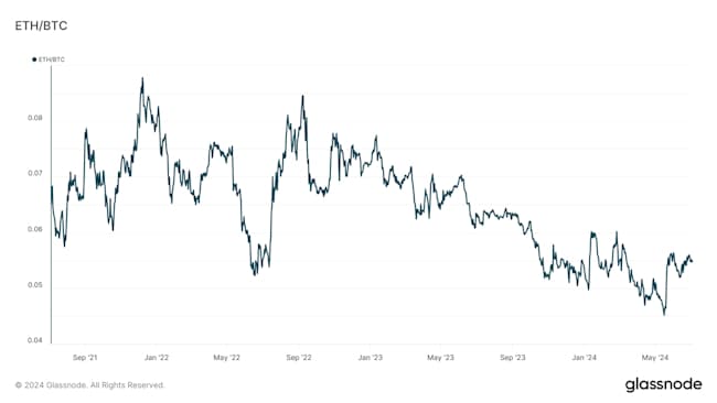 The ETH/BTC ratio reached its lowest point in three years this May, preceding the approval of ETH spot ETF filings. While this ratio has since improved, it remains 14% lower than its position one year ago.