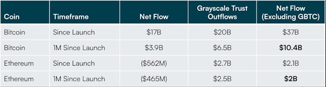 Interestingly, Ethereum's share of global ETP Assets Under Management (AUM) stands at a respectable 15.4% compared to Bitcoin. This figure aligns closely with Ethereum ETF inflows relative to Bitcoin ETF inflows (ex-Grayscale) over the first month, which sits at 19%. These statistics suggest that: