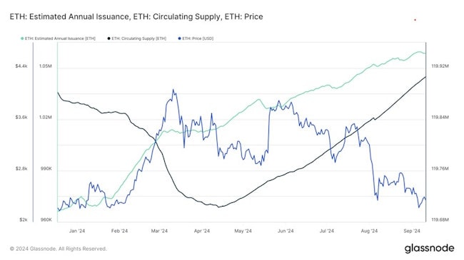 Figure 3: ETH: Estimated Annual Issuance, ETH: Circulating supply, ETH: Price
