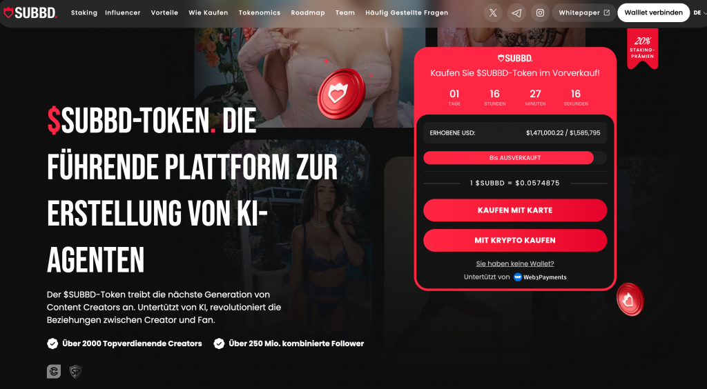 In Risk-Off-Phasen suchen Anleger oft nach zwei Dingen zugleich: Stabilität im Kernportfolio und optional nach asymmetrischen Chancen am Rand. Genau hier taucht in manchen Community-Kreisen SUBBD auf: ein Presale-Token, der sich als AI-gestützte Creator-Plattform positioniert – also eine Wette auf die Schnittstelle aus „Creator Economy“ und KI-Tools. Auf der offiziellen Seite wird der Presale-Preis mit 0,0337 US-Dollar je Token angegeben.