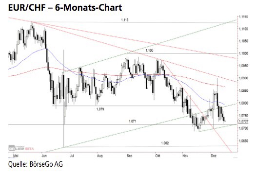Anschliessend entwickelte sich das Währungspaar seitwärts oberhalb der 1,071 CHF-Marke und bewegte sich in eine mittelfristig symmetrische Dreiecksformation hinein. In den vergangenen Monaten wurde die 1,079 CHF-Marke als Unterstützung beachtet, jedoch im November nach unten durchbrochen. Der Kursverlauf fing sich anschliessend wieder im Bereich der 1,071 CHF-Marke und bildete eine Gegenbewegung bis zum mittelfristigen Abwärtstrend aus. Darunter rutschten die Notierungen jedoch wieder zurück, um die 1,071 CHF-Marke an den Vortagen zu erreichen.
