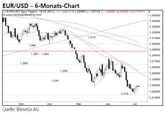 Ausblick: Das Währungspaar EUR/USD ist weiterhin massiv unter Druck. Die aktuelle Seitwärtsphase ist aus unserer Sicht nur als eine Zwischenstation vor einem weiteren Ausverkauf zu werten. Die Short-Szenarien: Nach einem zwischenzeitlichen Wiederanstieg bis 1,235 USD könnte EUR/USD erneut bis 1,215 USD zurückfallen. Würde diese Marke unterschritten, wäre mit einer Fortsetzung der Baisse bis 1,200 USD und auf mittlere Sicht bereits bis 1,185 USD zu rechnen. Auf diesem Niveau könnte eine mittelfristige Bodenbildung gelingen. Die Long-Szenarien: Ein Anstieg über 1,235 USD könnte dagegen für eine kurzfristige Entspannung und eine leichte Aufwärtsbewegung bis 1,250 USD sorgen. Am generell bearishen Ausblick würde dies aus unserer Sicht wenig ändern. Vielmehr dürfte EUR/USD bereits an dieser Marke wieder zurückfallen. Erst ein Ausbruch über 1,250 USD könnte für ein erstes bullishes Signal sorgen und einen Anstieg bis 1,275 USD einleiten.